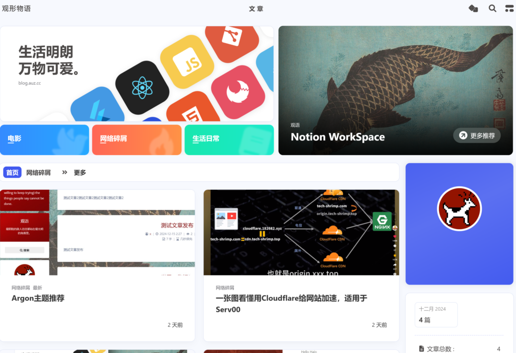 免费构建个人博客Hexo + GitHub + Cloudflare x | 2024-12-17 22:24 | 4,302 | 随笔 66 字 | 几秒读完 参考文章:https://linux.do/t/topic/298986关于书写 Markdown抽空研究下 主题的美化设置还没来得及折腾看下安装效果图 实例:https://blog.auz.cc/ AUZ为Authorization的缩写,“授权,委托”